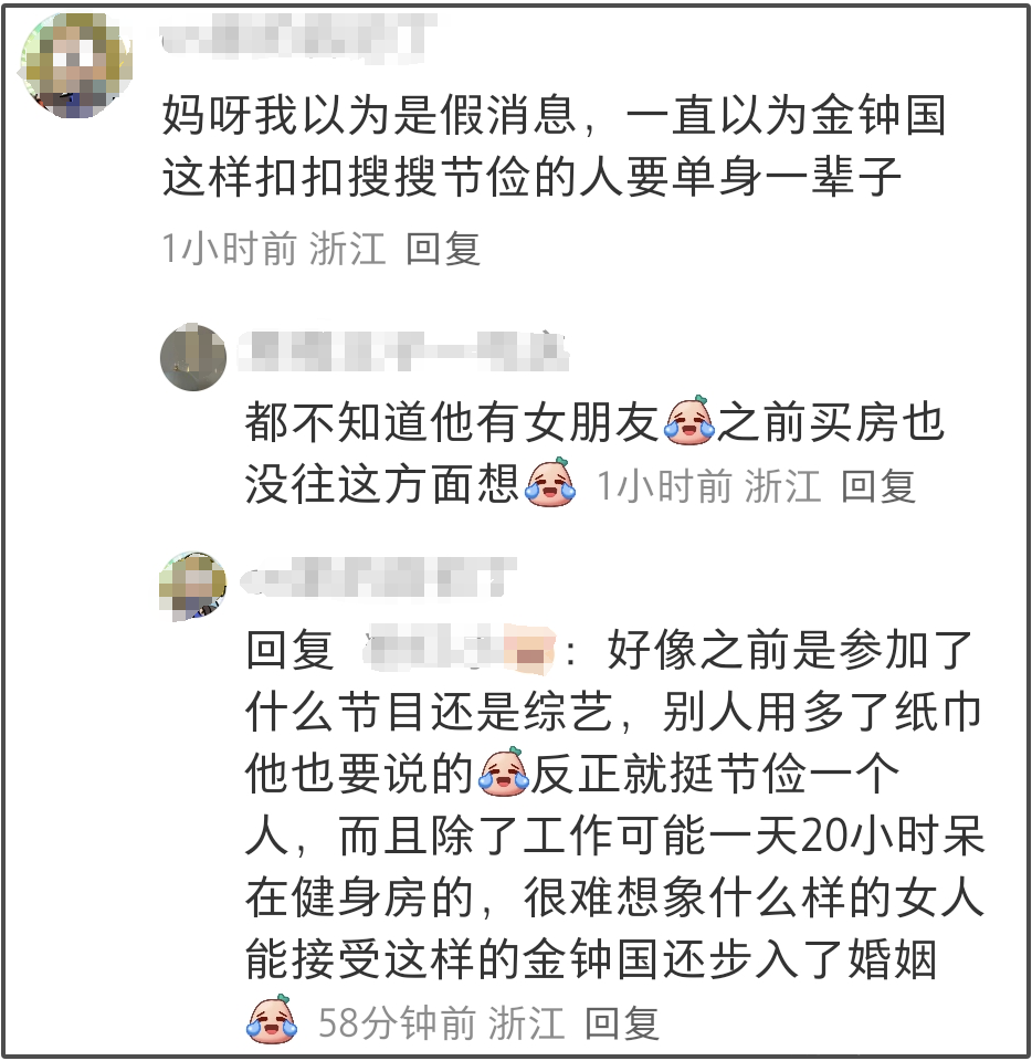 面对熟悉的明星突如其来的结婚消息,网友当然祝福更多,不过隐隐约约还是有些担心,因为金钟国多年来给人印象除了身体强壮,剩下最大的标签就是抠门了,生活习惯一般人很难适应。