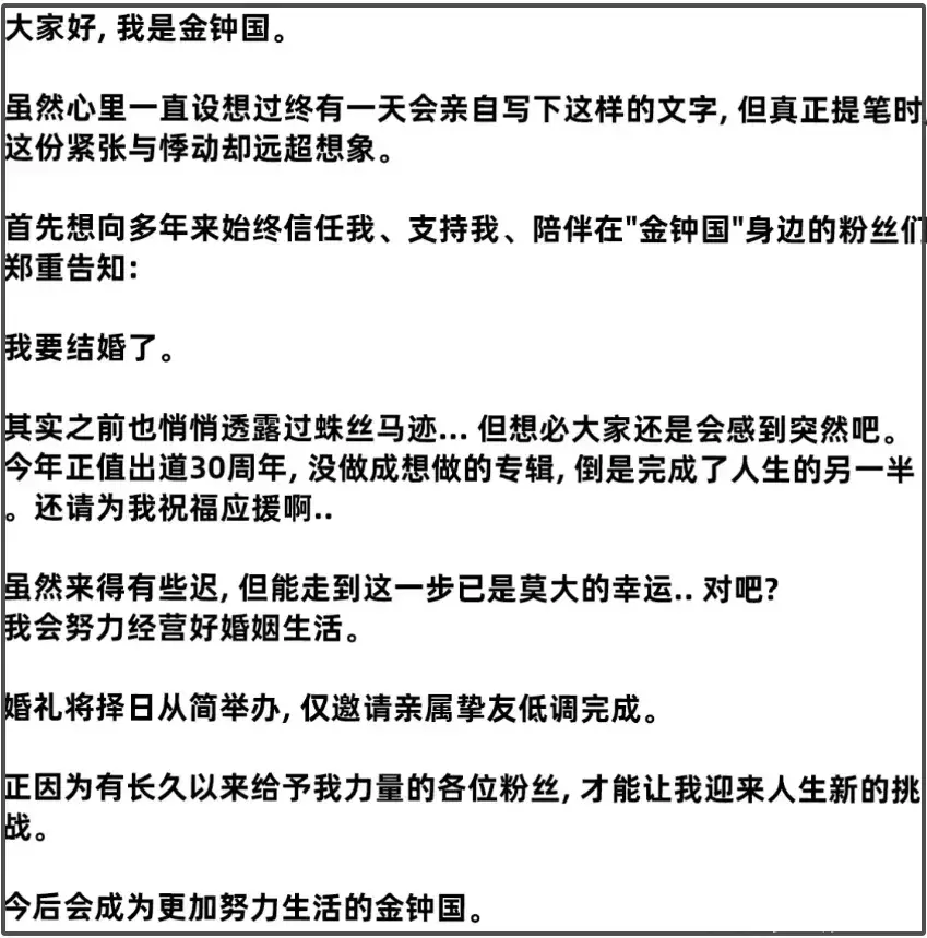 后续金钟国本人发布手写信,表示自己之前其实偷偷透露了蛛丝马迹,希望获得外界祝福,未来会努力经营好婚姻生活。