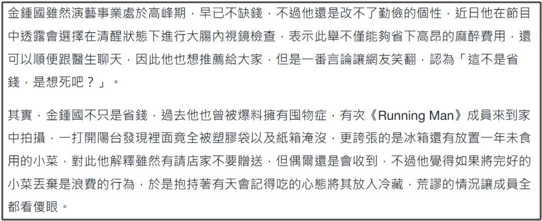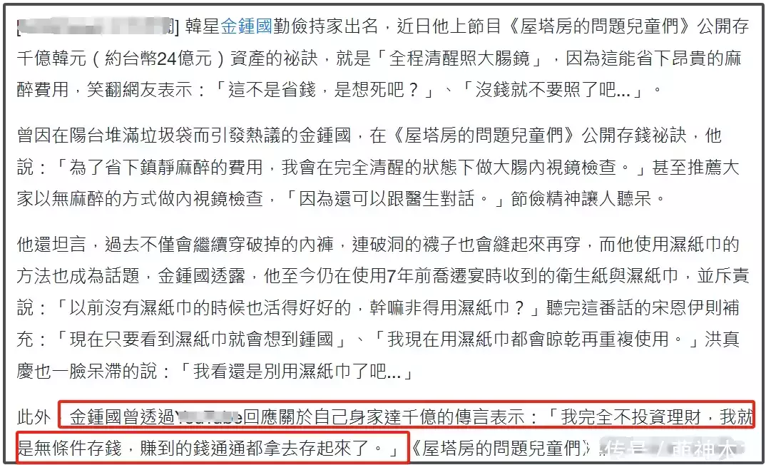 ——夏天不开空调、拖鞋只买均码、拒绝使用湿纸巾、做肠镜都要省麻醉……金钟国的抠门并非完全综艺人设,同样受到原生家庭影响。
