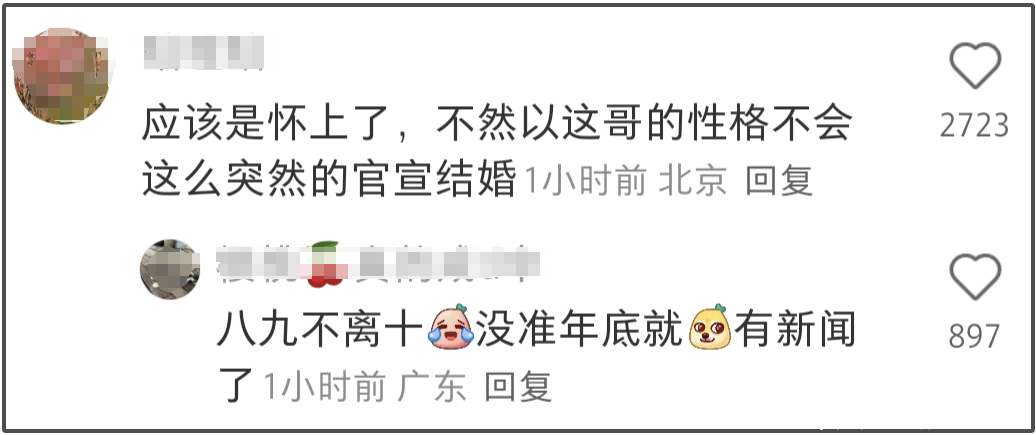 参考其他同年龄男星婚育情况,大龄不婚还单身的男明星,松口结婚不久妻子就官宣怀孕了,很容易给人一种他们娶妻就是为了生儿育女的感觉——各取所需,无可厚非,但总觉得有些微妙。