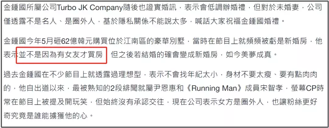 金钟国经纪公司则表示金钟国新婚妻子是圈外素人,希望外界不要过度打扰。